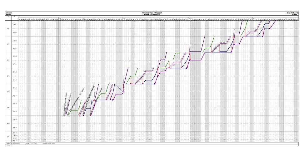 The LBMS methodology maximises the opportunity for on-site work crews to deliver optimal productivity by providing zones for conflict free production. The Construction program can function as an early warning system. By tracking completed locations, the total quantity of work-in-place can be easily calculated. Weekly reporting of total manpower on-site makes it possible to calculate actual productivity and actual production rates. These rates can be used to forecast and identify problems much earlier than in other project management systems. Output from the 4D program can provide reports including gantt charts, resource balance histograms, cashflow and production control in addition to animations that accurately represent the construction sequencing. Animation of the construction sequence uses calculated durations derived from quantities within the Construction Calibre model in a location sequence to demonstrate how the building will come together and identify constructability issues prior to construction commencing.